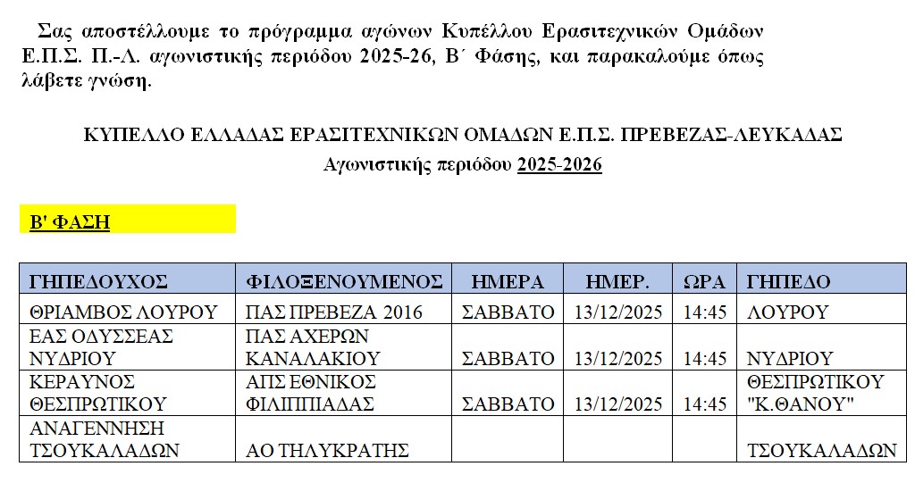 Πρόγραμμα αγώνων 2ης φάσης κυπέλλου