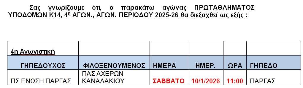 ΔΙΟΡΘΩΣΗ αγωνα ΠΡΩΤΑΘΛ.ΥΠΟΔ. Κ14, 4η αγων