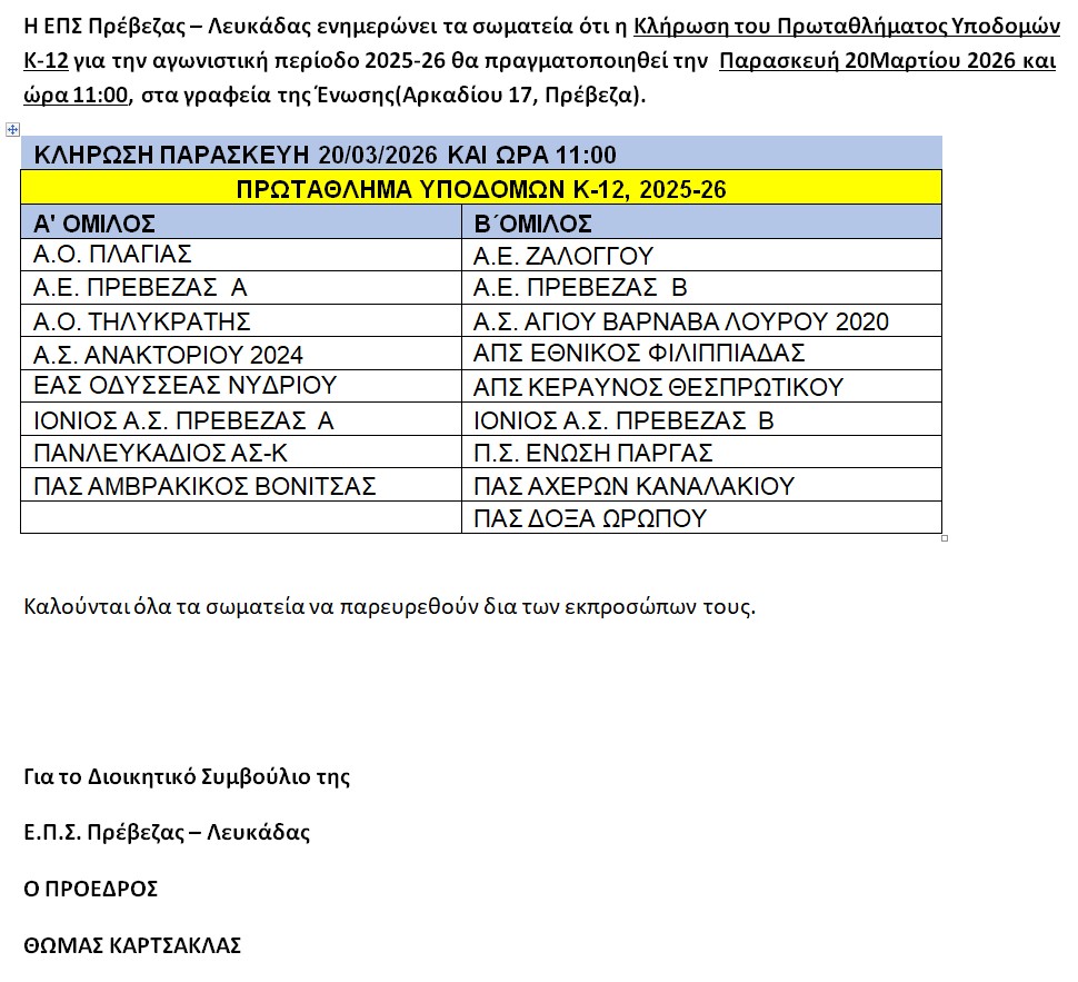 ΚΛΗΡΩΣΗ ΠΡΩΤΑΘΛΗΜΑΤΟΣ ΥΠΟΔΟΜΩΝ Κ12 2025-26 20.03.2026