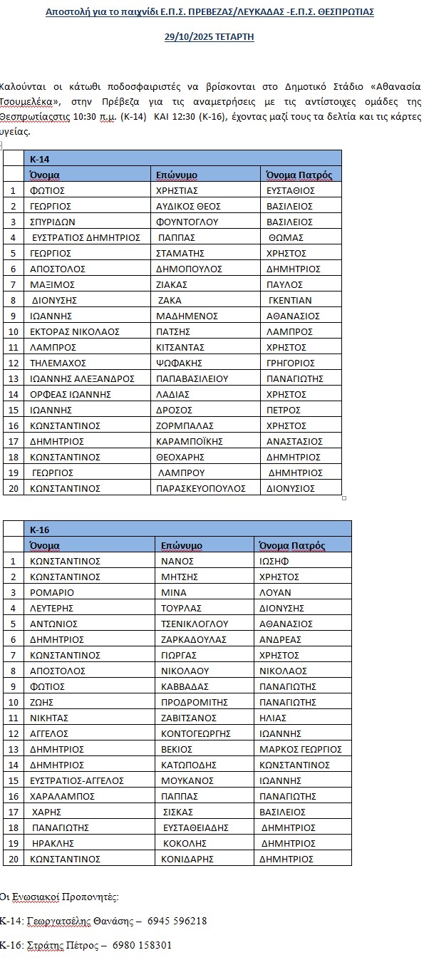 Αποστολή για το παιχνίδι ΕΠΣ ΠΡΕΒΕΖΑΣ ΛΕΥΚΑΔΑΣ - ΕΠΣ ΘΕΣΠΡΩΤΙΑΣ 29/10/2025