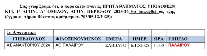 ΑΛΛΑΓΗ αγωνα ΠΡΩΤΑΘΛ.ΥΠΟΔ. Κ14, 1η αγων, Α ΟΜ., ΕΔΡΑ