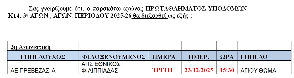 ΑΛΛΑΓΗ ΑΓΩΝΑ ΠΡΩΤΑΘΛ.ΥΠΟΔ. Κ14, 3η αγων