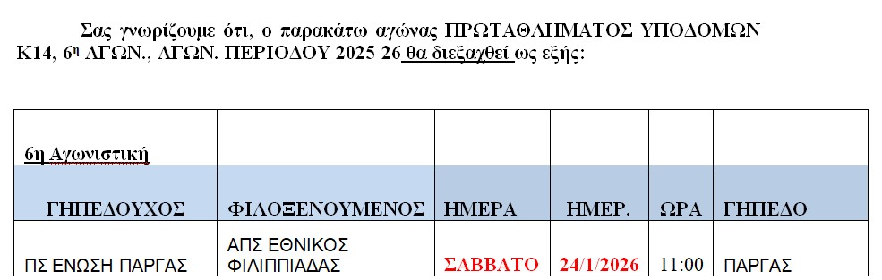 ΑΛΛΑΓΗ αγωνα Κ14., 6η αγων