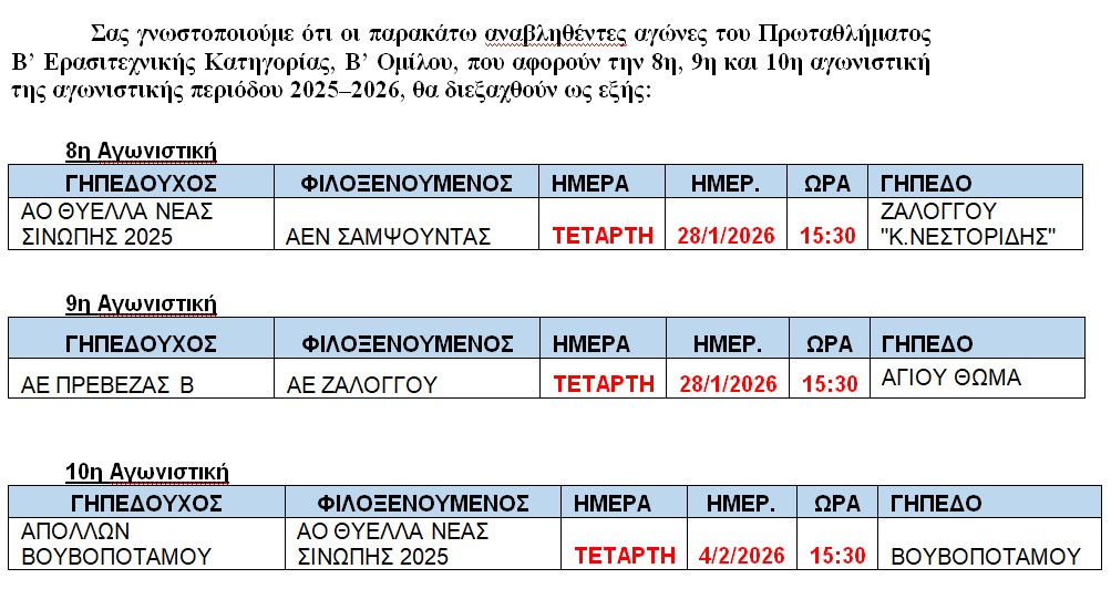 Ορισμός αναβληθέντων αγώνων Β' ερασ. Κατηγ. Β' Ομ. 8,9,10η Αγων