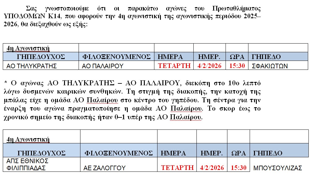 Ορισμός αγώνων Κ14 4η Αγων